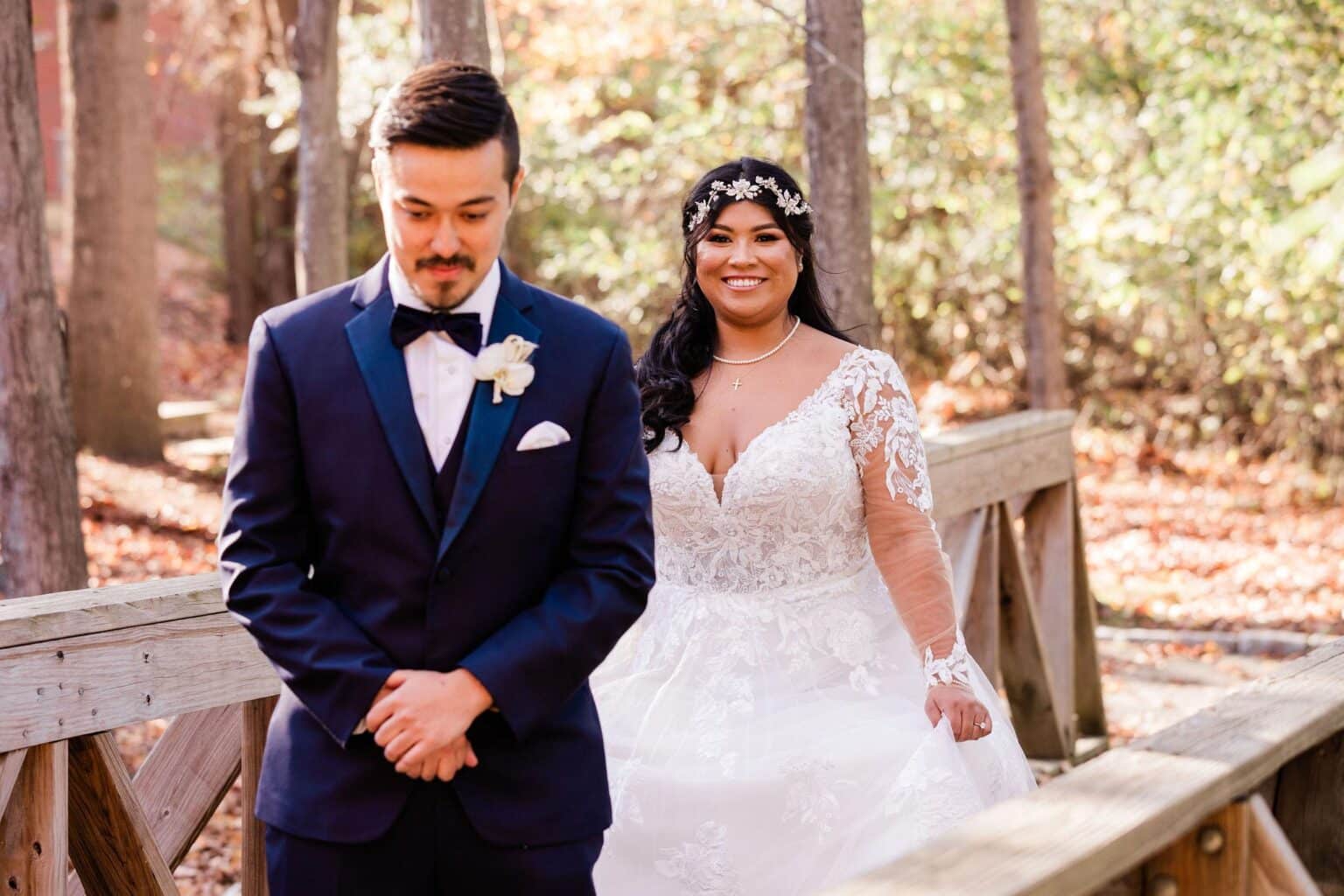 Having two outdoor photo locations right on property is a huge feature of The Four Points by Sheraton Norwood. To take full advantage of your day, consider having the “first look” before your ceremony.  During the first look, your photographer captures a few intimate moments where you see each other for the first time, then, can bring in your wedding party and immediate family to check off all your ‘must have’ photos before the ceremony. This stretches out the amount of time you have for the wedding and allows you to take full advantage of the cocktail hour! With the extra time, you can take photos at both our rustic bridge and landscaped waterfall without worrying about time restraints.