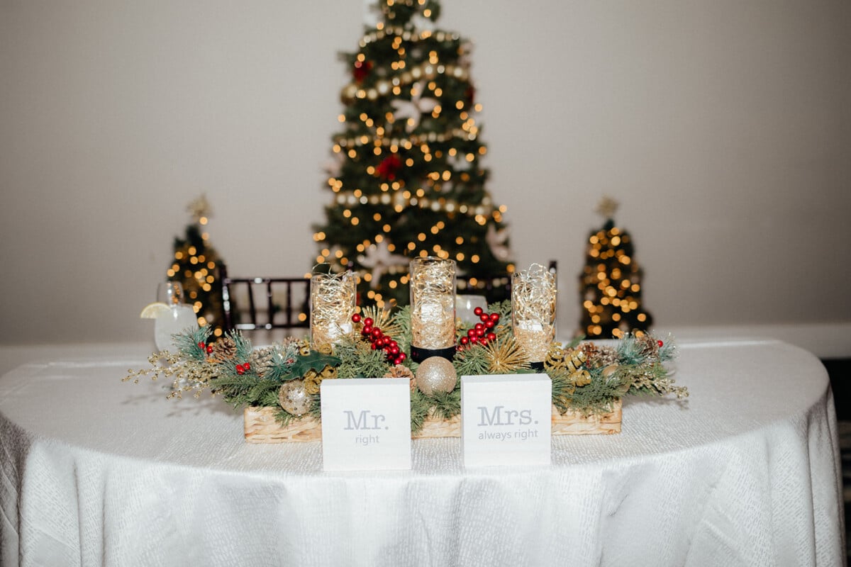 If you’re looking to add some glamor and sparkle, metallic accents like gold or silver can be incorporated as well. And, romantic accents such as lanterns with flickering candles or silver buckets overflowing with fragrant evergreens can make for a unique touch. Remember that lighting can also play a significant role in creating a warm and inviting ambiance. For a romantic glow, consider using candles in your centerpieces or up lights to brighten up the space.