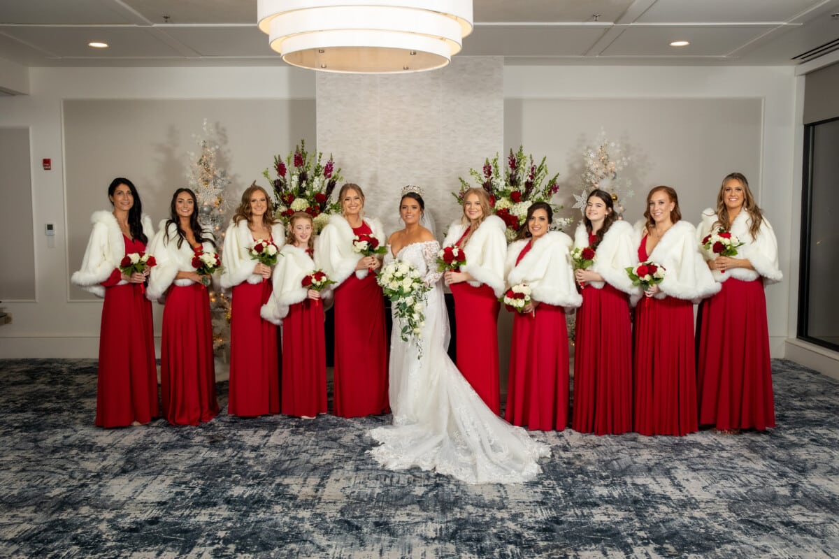 For the bride, a long-sleeved lace gown or a velvet wrap are perfect to keep her warm and stylish. These options not only exude elegance but also ensure that she feels comfortable throughout the winter wedding ceremony and reception. As for the bridesmaids, you can have fun with their attire while still maintaining a cohesive look. With a range of colors and styles to choose from, it’s easy to find the perfect dresses that flatters each bridesmaid’s unique personality. Choose from deep jewel tones to icy pastels to metallics or sequins. The possibilities are endless.