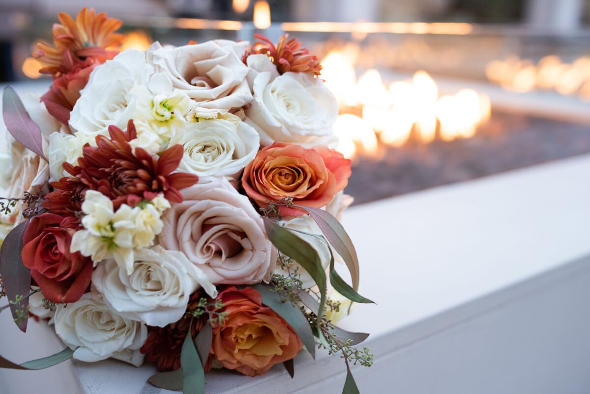 • Floral arrangements: Adding some fresh flowers in your centerpieces and bouquets with shades of green, brown, rust and even teal and purple. This will bring a natural element to the room and tie in with the earthy tones.