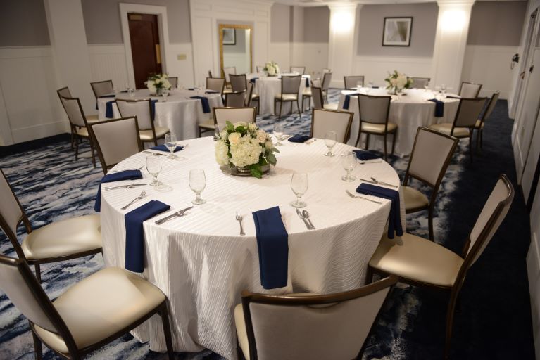 Our Essex and Lennox junior ballroom allow you to enjoy all the charm of the Tiffany Ballroom on a smaller scale. With beautiful gold framed mirrors, modern light fixtures, and plush blue and gray carpeting, these event spaces are perfect for groups as small as 50 people. The two junior ballrooms can also easily be combined to host events for up to 80 guests.