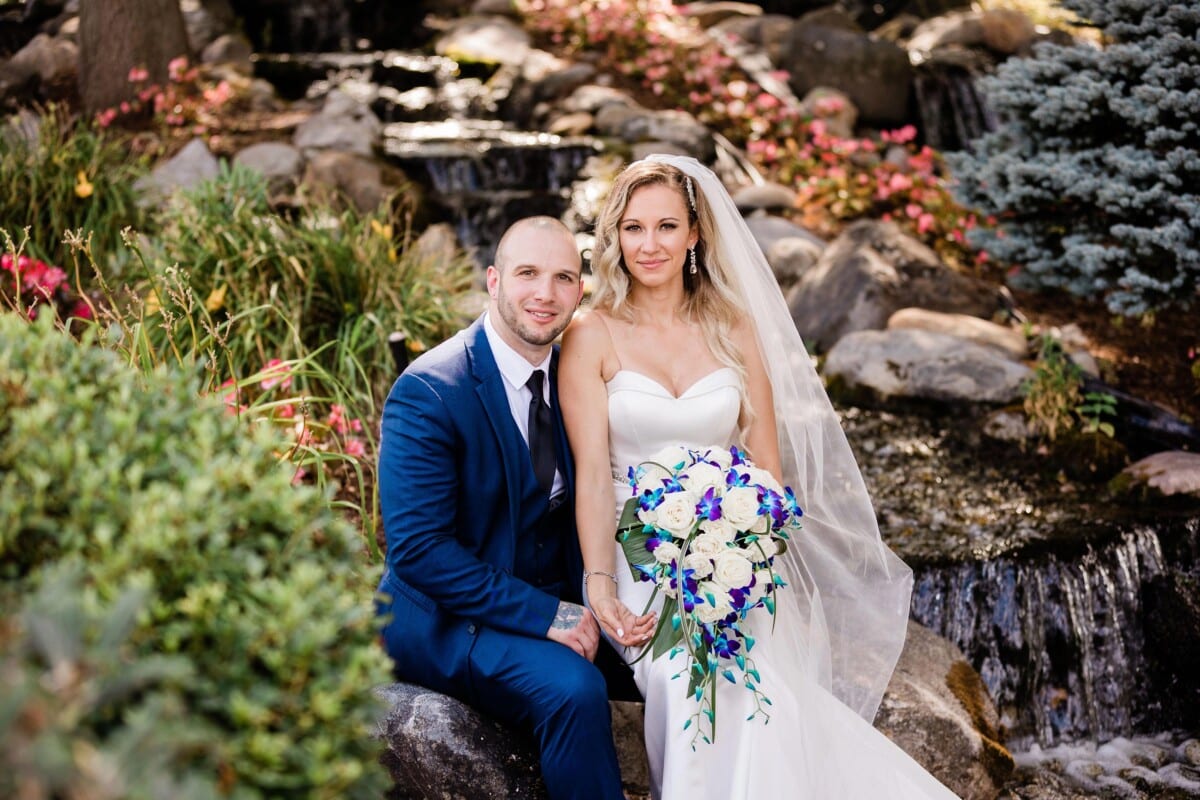 Our magnificent waterfall is highlighted by blooming bushes and gets a pop of color from seasonally planted flowers. Its large gravel base with pavers allows plenty of space for your entire wedding party or extended family to spread out.